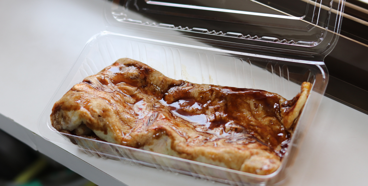 イカの切り身を入れた生地をプレスして薄く焼き、甘辛いソースを塗ったB級グルメ!
